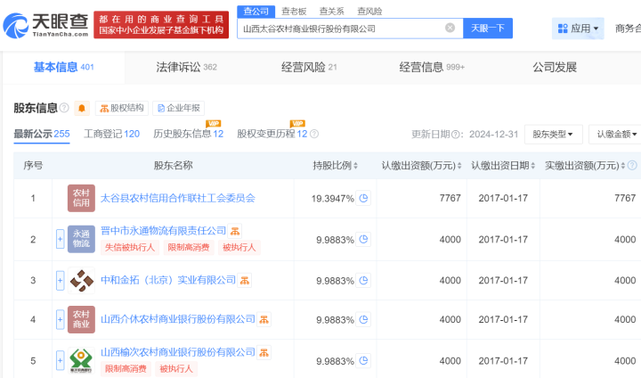 公开资料显示,山西太谷农村商业银行是晋中市太谷区的地方性金融机构。其前身为太谷县农村信用合作联社,2017年完成改制,注册资本4亿元,总部位于太谷区108国道73号,下辖26家分支机构,截至2024年拥有员工320人。天眼查数据显示,在股权结构方面,太谷县农村信用合作联社工会委员会以19.3947%的持股比例位列第一大股东,认缴出资7767万元;晋中市永通物流有限责任公司、中和金拓(北京)实业有限公司、山西介休农村商业银行股份有限公司、山西榆次农村商业银行股份有限公司并列第二大股东,持股比例均为9.9883%,认缴出资额4000万元。值得注意的是,晋中市永通物流有限责任公司与山西榆次农村商业银行股份有限公司存在失信被执行人、限制高消费、被执行人等不良信用记录。