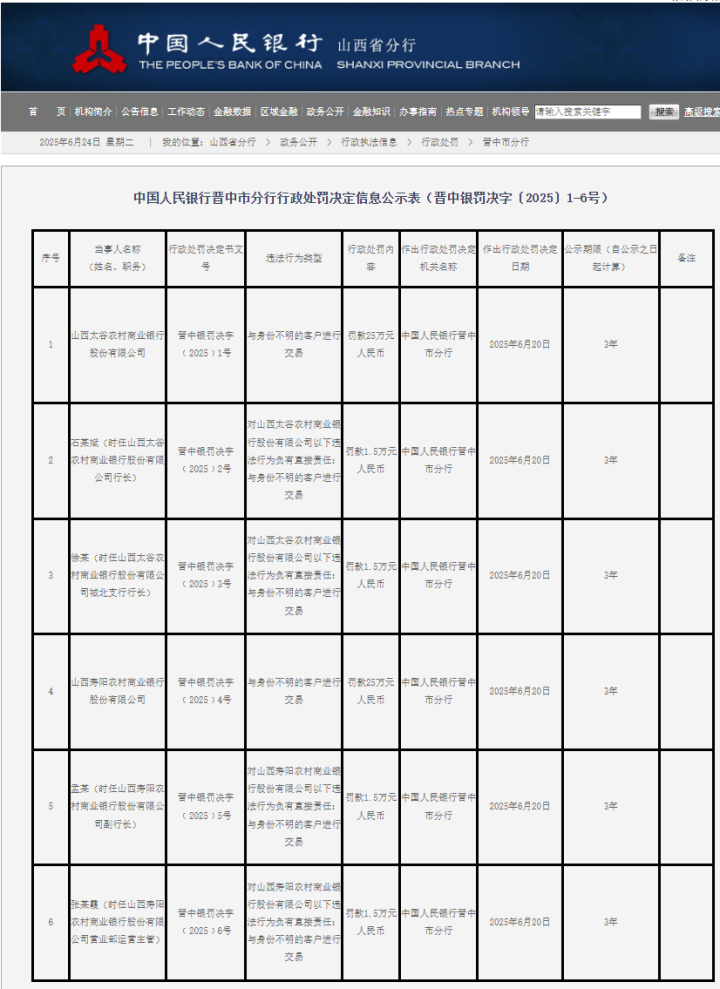 中国人民银行晋中市分行行政处罚决定信息公示显示,山西太谷农村商业银行、山西寿阳农村商业银行均因“与身份不明的客户进行交易”违规行为,双双被处以25万元罚款。同时,时任山西太谷农村商业银行行长石某斌,依据晋中银罚决字﹝2025﹞2号行政处罚决定书,于2025年6月20日因对此次违规行为负有直接责任,被罚款1.5万元;同日,时任山西寿阳农村商业银行副行长孟某,也因对该行同类违法行为负有直接责任,根据晋中银罚决字﹝2025﹞5号行政处罚决定书,受到1.5万元罚款。此外,两家银行各有一名直接责任人也被处以相同金额的罚款。